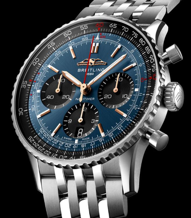 The new Navitimers may look like the old from a distance (round slide rule, stick hour markers, chronograph trio, notched bezel), but a closer look reveals modern improvements and additions. These 2022 Navitimers are available in multiple case sizes: 46mm, 43mm and 41mm. The new version is available in two case materials (stainless steel or 18K red gold), as well as a choice of strap/bracelet (semi-shiny alligator leather or stainless steel or 18K red gold seven-row metal bracelet). The colors of the new aviation chronograph dials are subtle, subdued and very special: ice blue, dark blue, dark green, mint green, copper, black and silver. But for those familiar with the Navitimer range, the most notable change is the return of the AOPA wing to its original position at 12 o'clock.